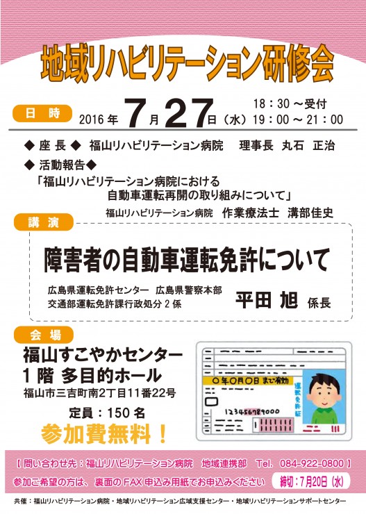 地域リハビリテーション研修会を開催します。 投稿日:2016年7月7日 |お知らせ 平成28年7月27日 午後7時より 福山すこやかセンター 1階多目的ホールにて 地域リハビリテーション研修会を開催します 内容は、以下の通りです どうぞ、皆様お誘いあわせいただきましてご参加ください